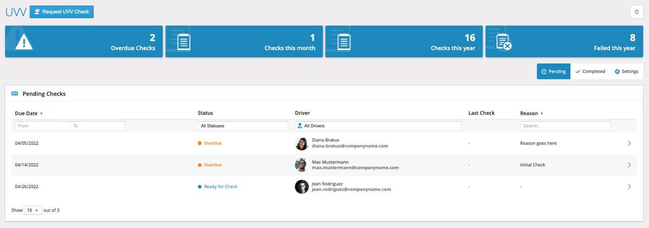 With the new driver section for driver license checks and UVV (accident prevention regulation) you have all important information about your drivers on one single page combined. This includes:
