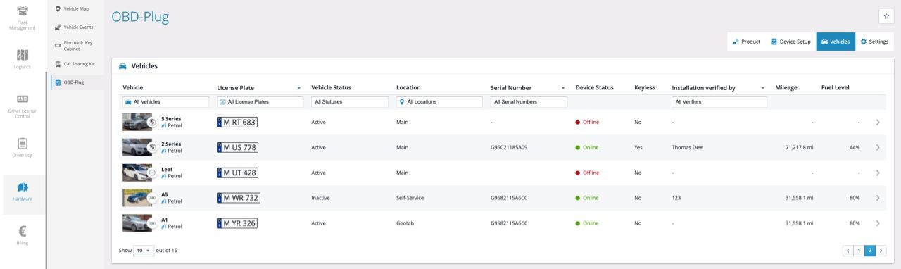 A new section is now available for customers with the Geotab dongle. It provides an overview of all vehicles and devices in the company.