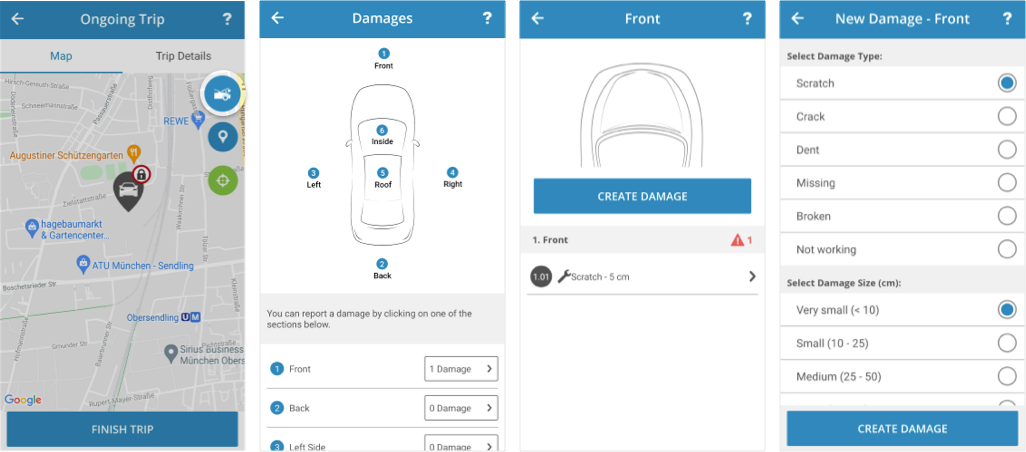 Until now, users were only able to add damages before the start or after a booking was completed. Through our user feedback feature in the app, we learned that damage documentation during the journey is desired by our customers. Thus, users of a Car Sharing system with an installed Car Sharing Kit can report damages directly during the trip.