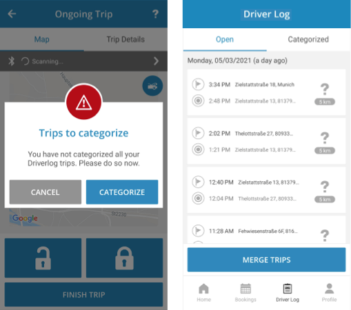 In order to ensure that in a car sharing scenario all driver logs are categorised promptly, the driver will be prompted to complete categorization before finishing his booking.