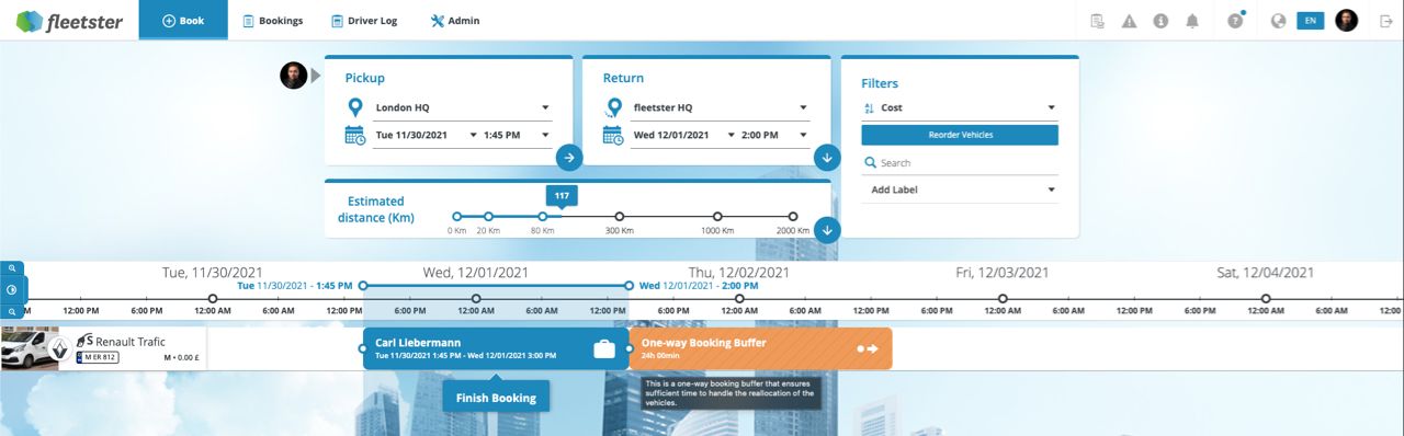 A one-way trip will relocate the vehicle to the new location when the relevant booking ends. A one-way trip can only be created for a vehicle if there are no bookings scheduled after the requested time frame. A one-way booking will block the vehicle until it is completed or cancelled.