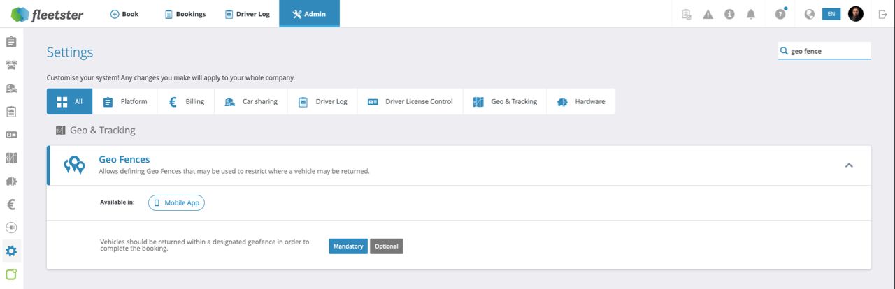 A new setting that allows defined geofence return zones to be skipped in the key return process. When the vehicle is outside the location return zones the warning to the user allows him to finish the booking anyways. Doing so will warn the administrator.