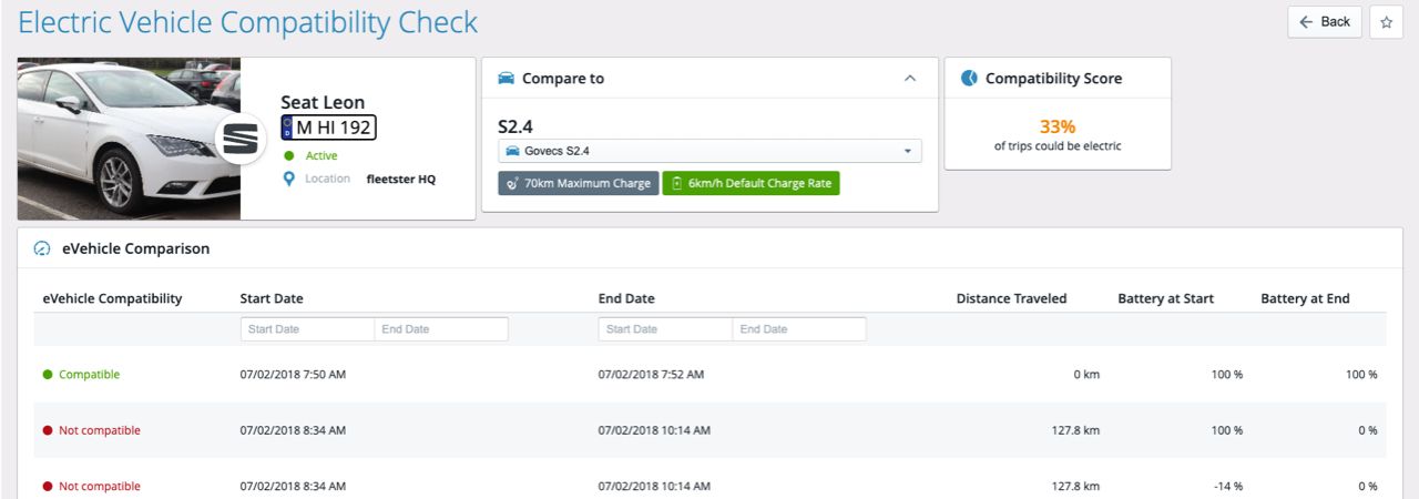 The eVehicle compatibility check analyzes available trip information from vehicle hardware. It is able to determine which trips would be feasible with different electric vehicle models.