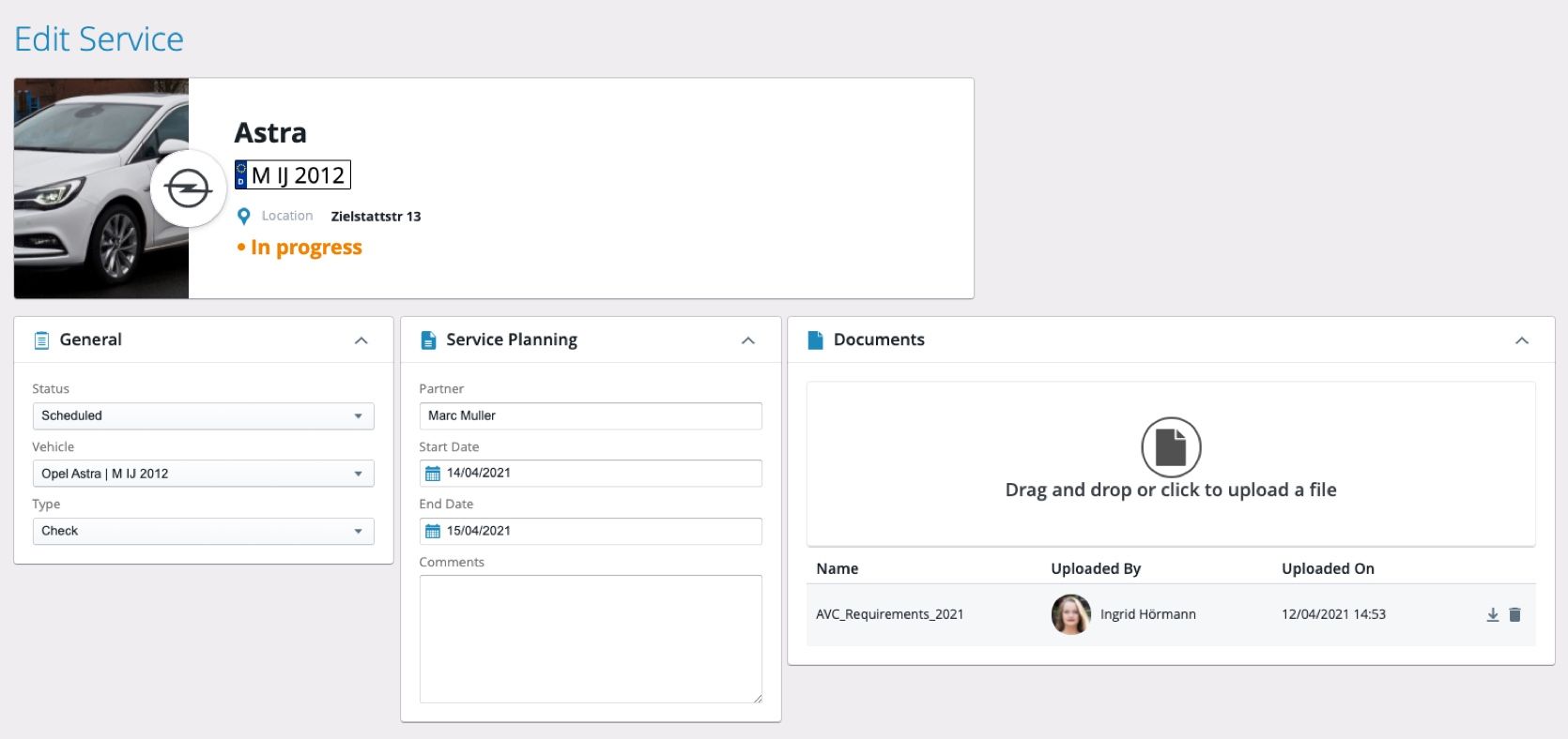 Services can be new, scheduled, in progress, done or paid. Information for the service partner or workshop as well as the service timeframe can be added to the scheduled service. Invoices or additional documents can be uploaded for ease of access and transparency.