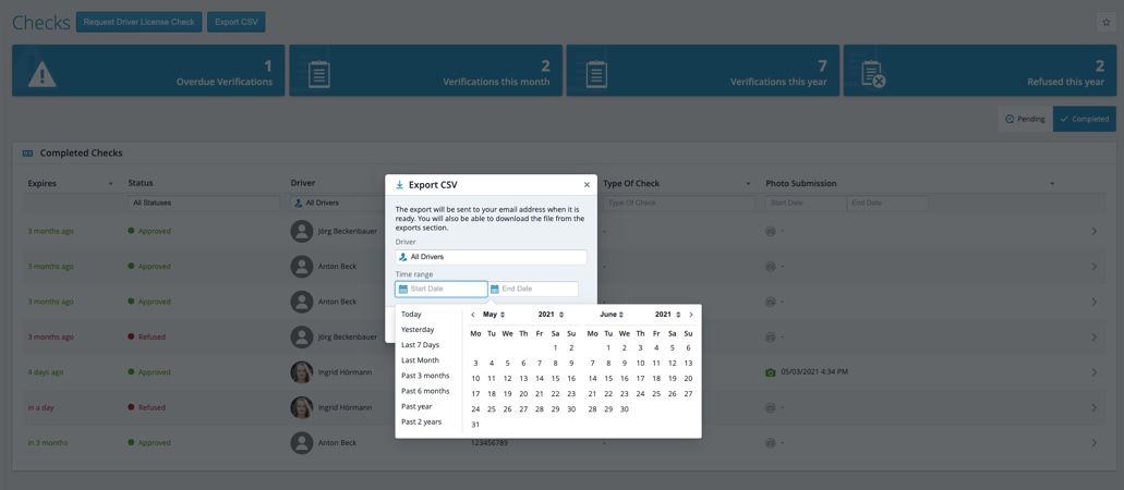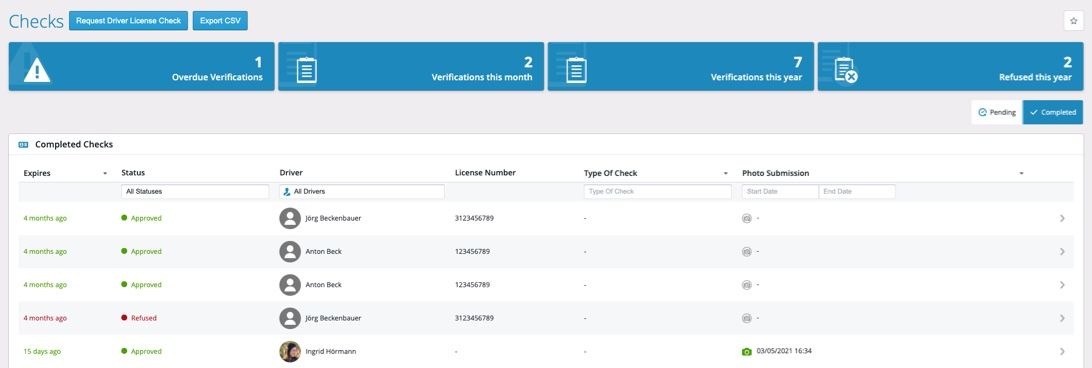 A CSV export function was added to the driver license checks list. In this way administrators can export the performed checks for a specific driver or for the fleet at large for authorities or internal controlling departments.
