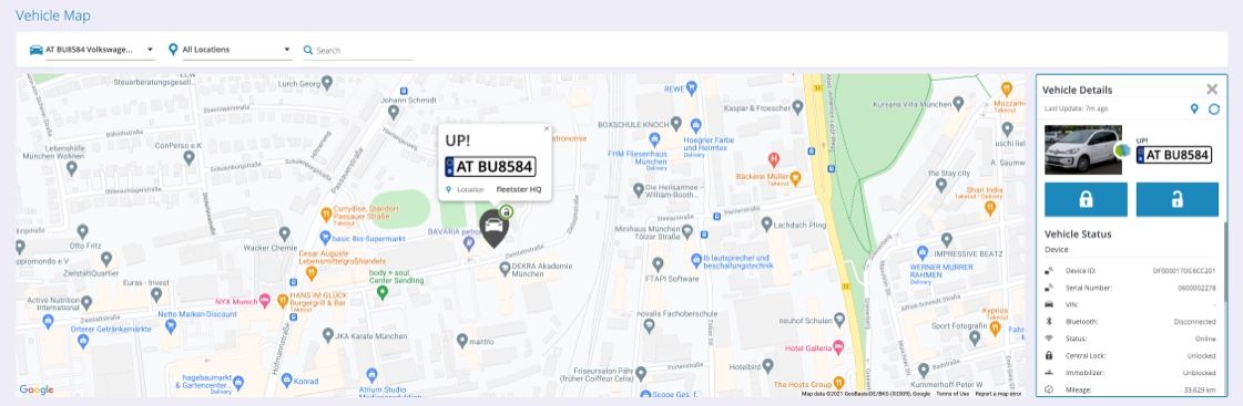 You're in control of your fleet with the Vehicle Map. This feature gives an overview of where your vehicles are and their status, enabling you to see which vehicle is closest or nearest for any needs that might arise during a workday.