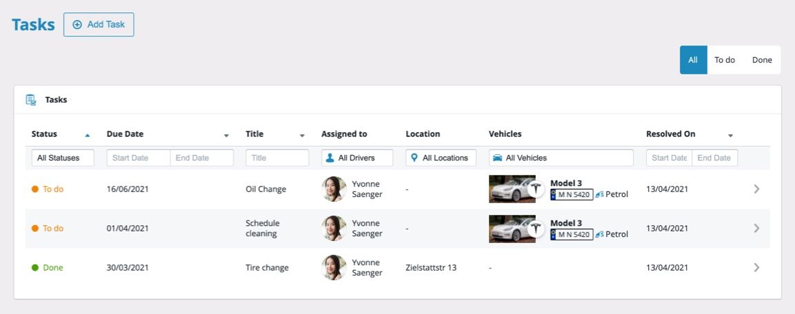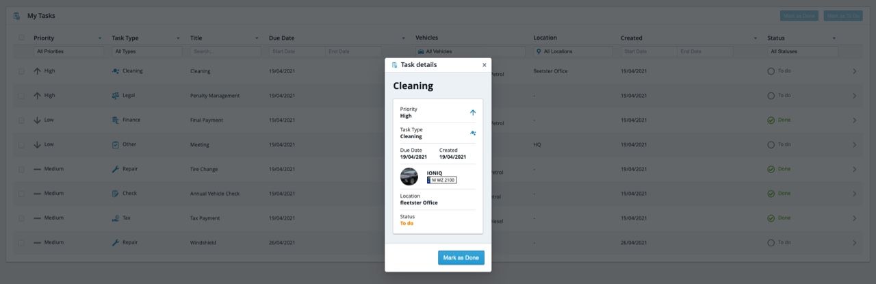 The tasks management feature of the fleetster fleet management module is meant to streamline the fleet manager's organization of responsibilities. Tasks have a title, description, due date, assignee and related vehicle or location. In this way, various practical responsibilities can be scheduled and delegated to users within the system.