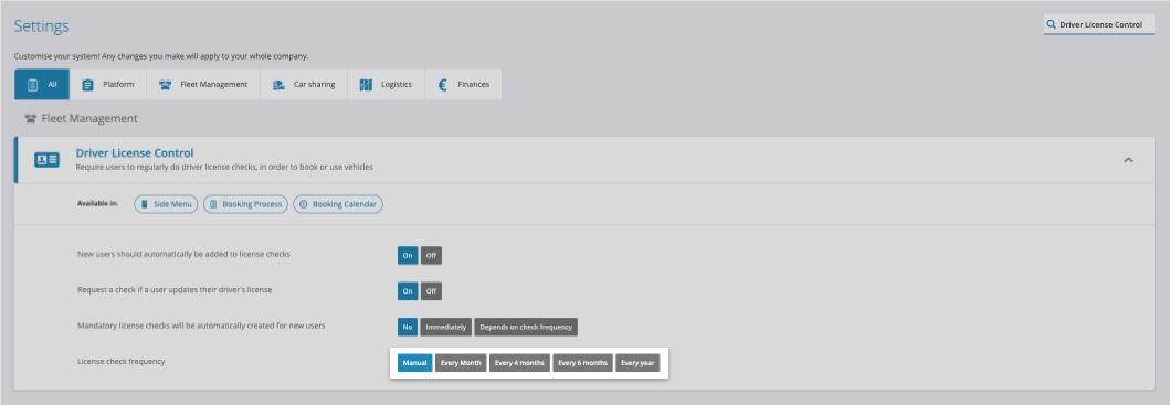 A new setting is now available for the Driver License Check module which allows administrators to have a manual check cycle. Normally the license of users needs to be verified every few months. With the manual cycle, the license only needs to be checked when a new one is provided or the admin specifically requests the check.