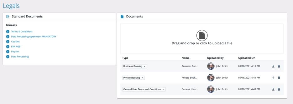Our brand-new legal documents function allows you to control the contract details and terms of service for your business or private travel. This helps control what needs accepting during user invitation and registration as well as any other document visible in the profile's legals section.