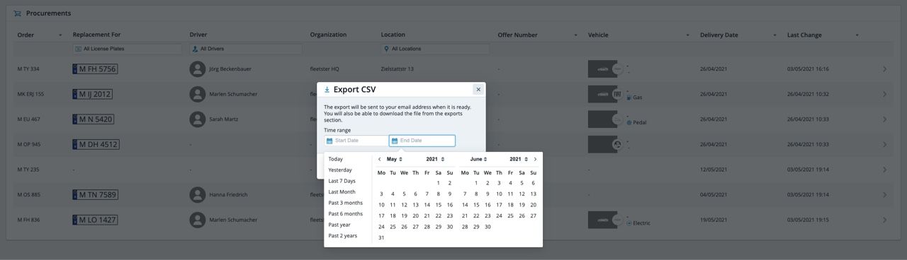 The recently developed procurement management feature for fleetster's fleet management module now provides a CSV export of all relevant data.